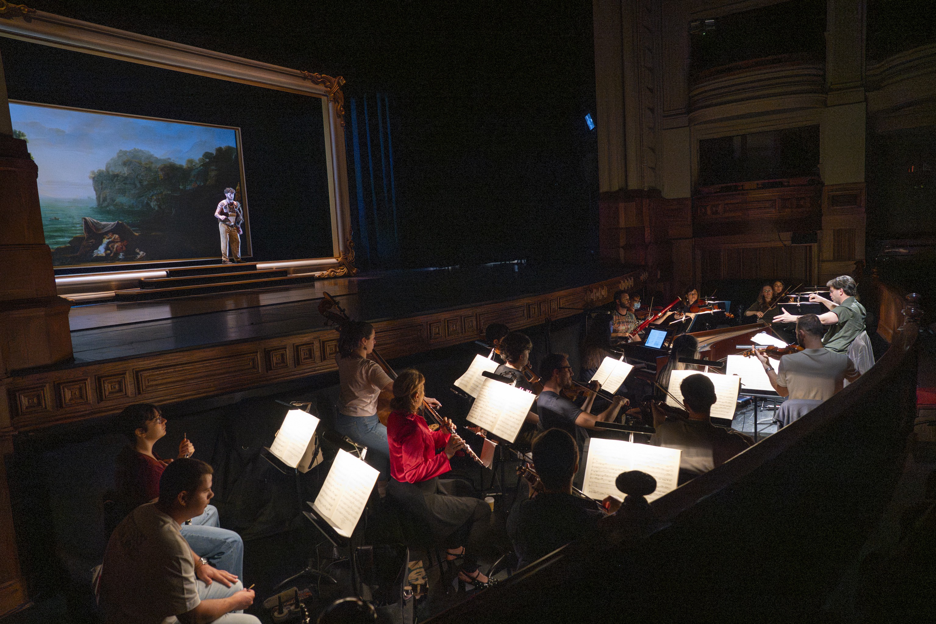 "La propuesta escenográfica parte de la iconografía de la pintura sobre el mito de Acis y Galatea, entendiendo la escena como un cuadro que cobra profundidad. Un marco de carácter barroco define el espacio, mientras el plano pictórico se desplaza hacia el fondo, abriendo el escenario y ampliando su percepción. Este plano se concibe como superficie de proyección, aportando dinamismo y transformación a la imagen, y permitiendo un uso más activo del espacio escénico, donde la acción trasciende el límite frontal de la pintura y convierte la escena en un lienzo habitable en diálogo constante entre mito, música y dramaturgia."