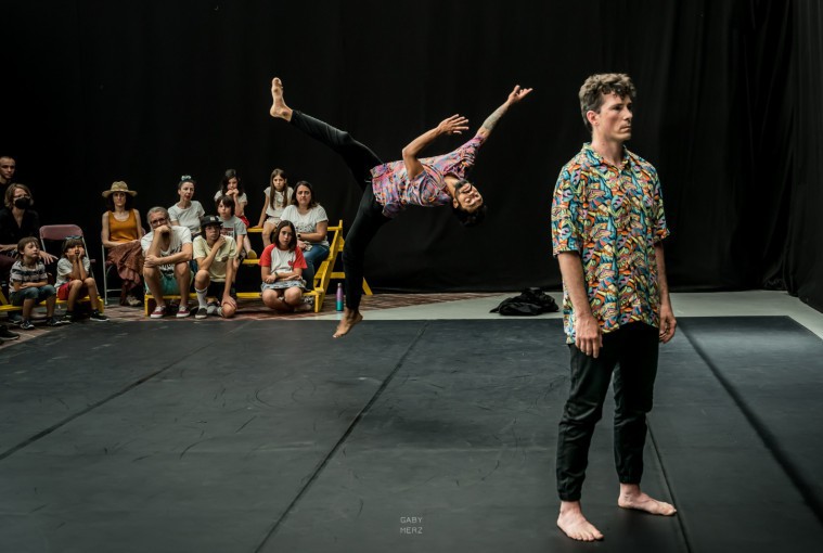 Dos cuerpos, Miguel Barreto, junto al que juegan a encontrarse, descubrir cómo se ven desde fuera, cómo los describe su reflejo. Al juntarse, construyen una estructura corporal particular uno encima del otro, jugando con la simetría, la duplicidad y la ambigüedad para componer imágenes sorprendentes, diálogos acrobáticos y escenas oníricas.