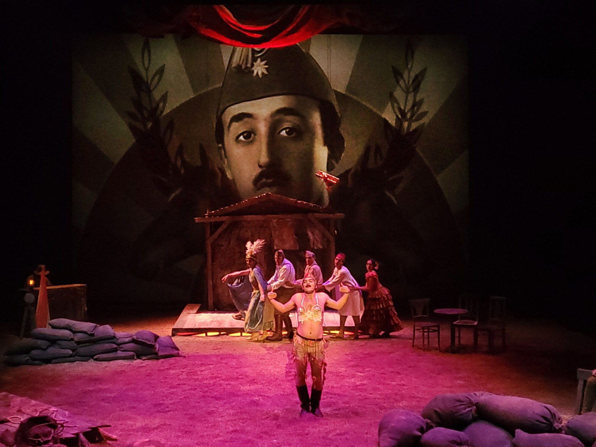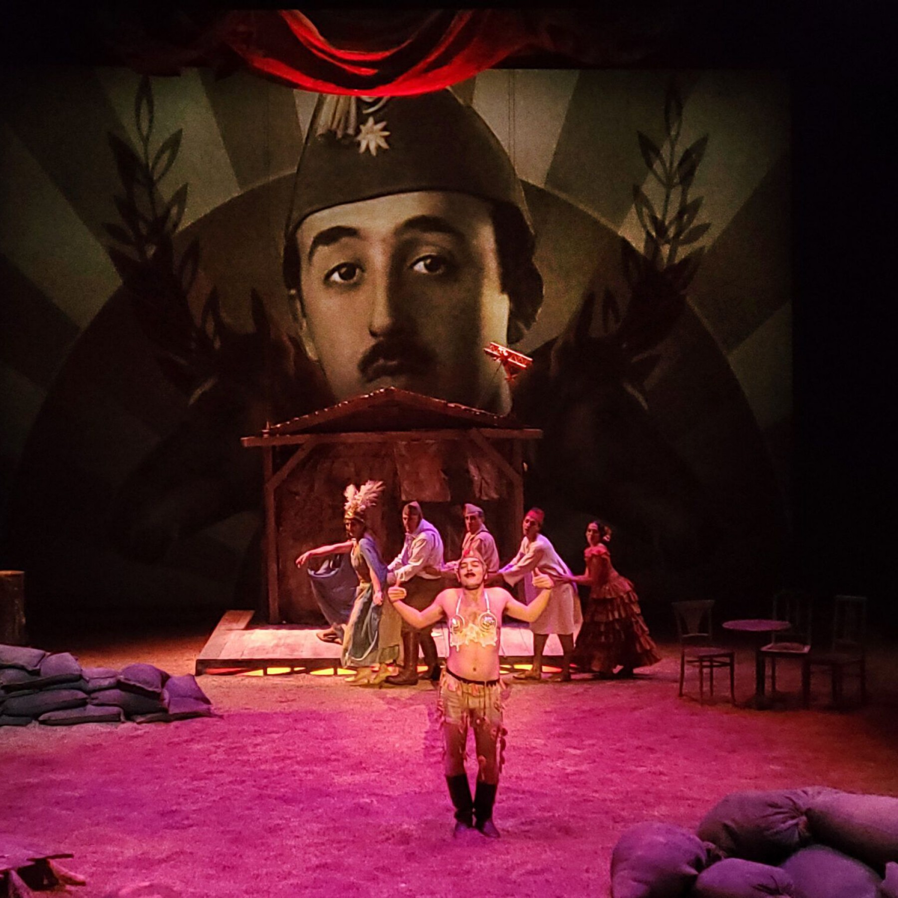 Desde ese punto de partida, por el escenario desfilarán personas claves de aquella disputa: diputados, altos comisarios, reyes, cantineras, prostitutas, caídes, artistas de cine, periodistas, militares y civiles. Con ellos, el público va a visitar, como si de una pesadilla grotesca se tratara, el café cantante y el blocao, el aduar y la marcha militar, el prostíbulo y el barranco, la sed insoportable, el cuerpo calcinado, la cabeza cortada, las entrañas. La cruda representación de una guerra innecesaria, que causó miles de muertes de españoles y rifeños.