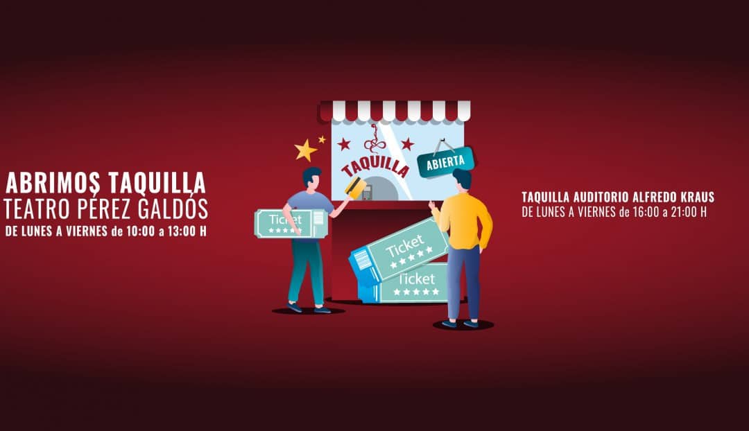 Nuestras taquillas vuelven a abrir para compra de localidades. El horario de atención de la taquilla del Teatro Pérez Galdós es de 10:00 a 13:00 horas de lunes a viernes; mientras que la taquilla Auditorio Alfredo Kraus permanece abierta en horario 16:00 a 21:00 horas, también de lunes a viernes.