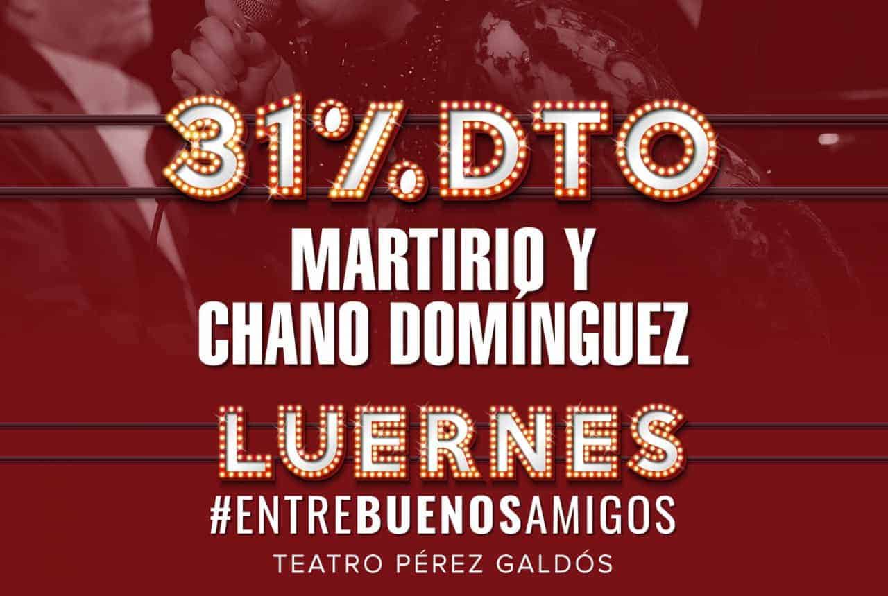 Hoy lunes por ser el Día de los Buenos Amigos, compra tus entradas para el concierto de Martirio y Chano Domínguez. Un concierto muy especial que podrás disfrutar a 15 euros. Solo hoy, solo por ser lunes. Cómpralas ya y ven el 9 de noviembre al Teatro Pérez Galdós.