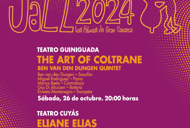Este singular festival, en el que cada entidad participante aporta un escenario y un destacado artista de jazz, contará con ocho conciertos que tendrán lugar entre octubre y diciembre, ofreciendo la oportunidad al público de disfrutar este año de los siguientes músicos y formaciones (ordenados por día de actuación): The Art of Coltrane (Ben Van Den Dungen Quintet) Sábado 26 de octubre, a las 20.00 horas, Teatro Guiniguada; Eliane Elías, sábado 2 de noviembre 2024, a las 19.30 horas en el Teatro Cuyás; Imaginando a Rita Payés & Perinké Big Band, viernes 8 de noviembre de 2024 a las 20:00 h, Teatro Pérez Galdós; Verónica Ferreiro & Javier Sánchez, sábado 9 de noviembre 19:30 horas Sala Insular de Teatro (SIT); Tingvall Trio, sábado 23 de noviembre a las 20.30 horas ‘El Rincón del Jazz’ del Auditorio Alfredo Kraus (Sala Jerónimo Saavedra); Maravijazz (Augusto Báez, J.M. Churchi y J.C. Machado) , sábado 30 de noviembre a las 20.00 horas, en el Teatro Guiniguada; Arube, viernes 13 de diciembre, a las 19.00 horas; Bjazz, jueves 19 de diciembre a las 19.00 horas, ambos en el Paraninfo de la ULPGC.